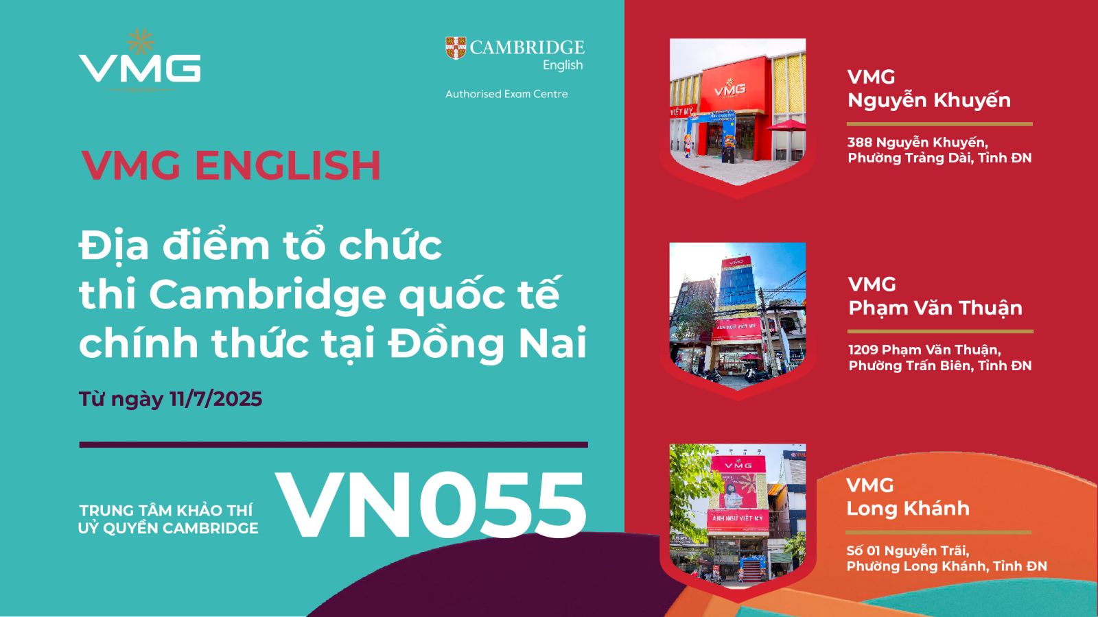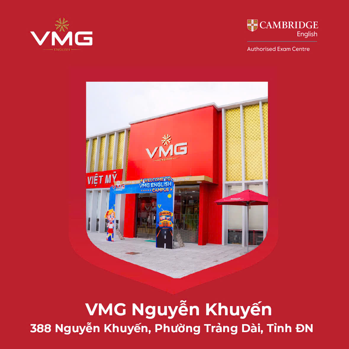 Sáng ngày 29/08/2025, tại VMG Nguyễn Khuyến - Biên Hòa, Công ty Giáo dục Việt Mỹ - VMG đã long trọng tổ chức Lễ Khai trương Trung tâm Khảo thí Ủy quyền Cambridge English VN055 & Địa điểm thi chính thức.